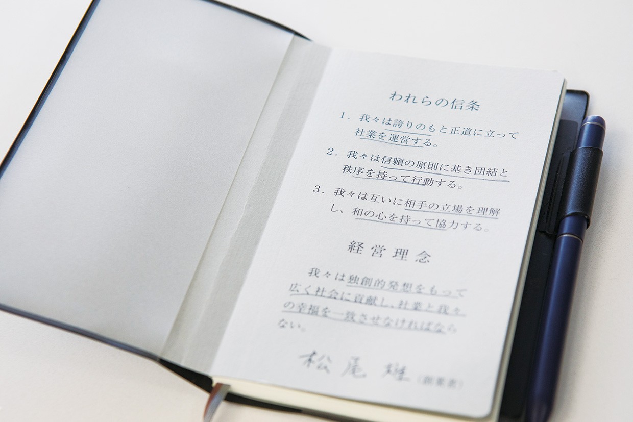 初代オーナーの松尾 雄氏が考えた経営理念や信条を書き込んだクレド。鈴木様は社長に就任しても文言を一切変えずに、迷ったときや何か新しいことをするときは、原点に立ち戻るようにと、今でも全社員へ渡す手帳に記載し配布している。