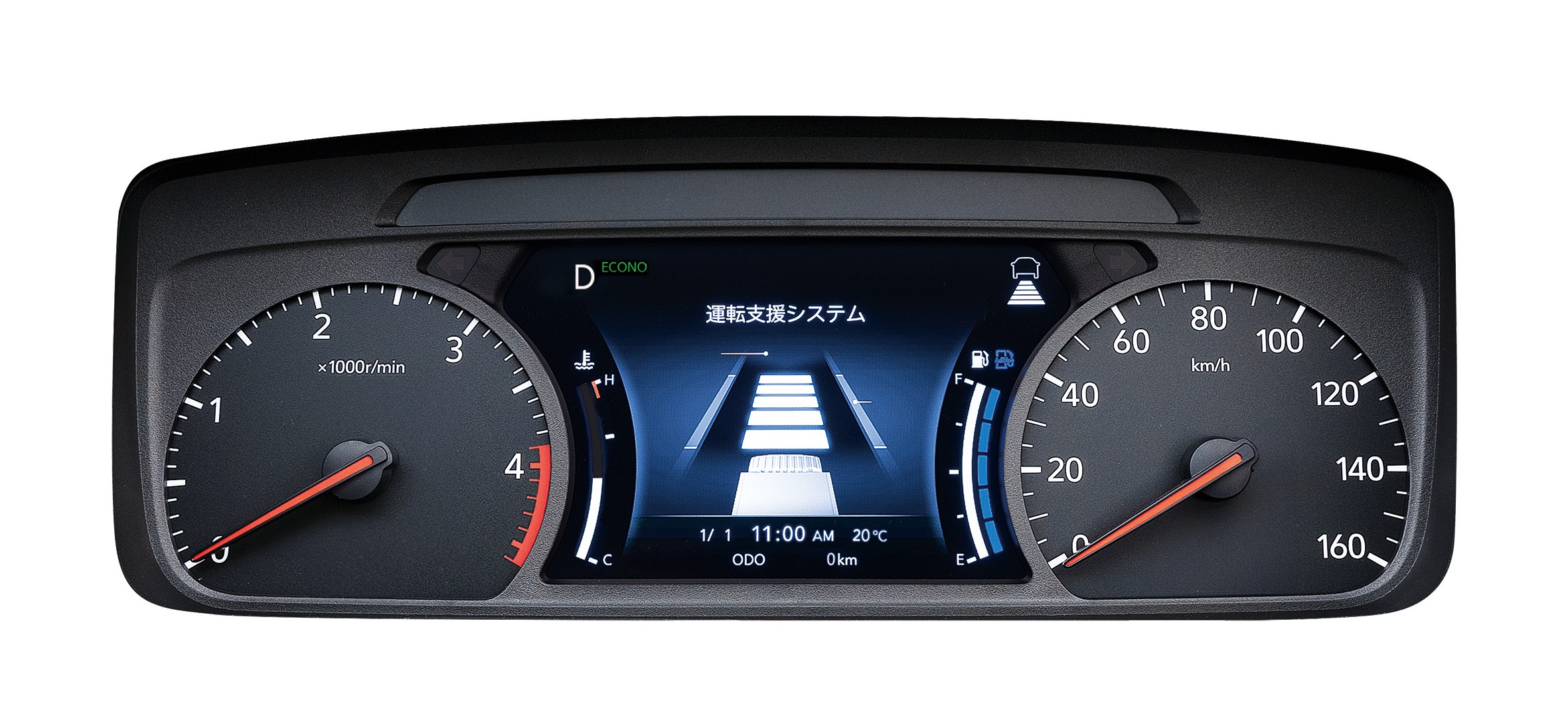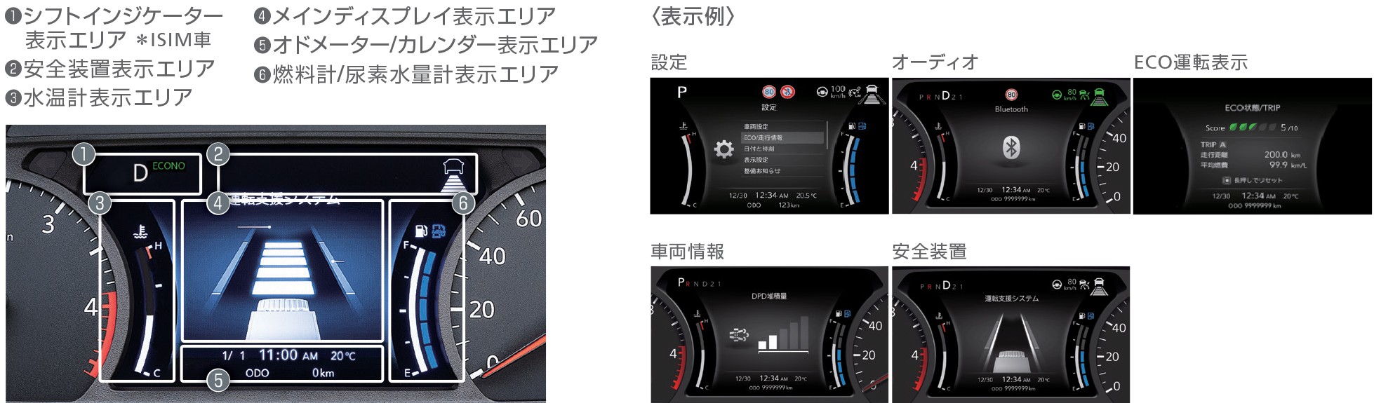 目的別に、❶「便利機能エリア」❷「先進安全装置スイッチ」❸「トラック固有装置関連スイッチ」❹「ランプ・ブザー/架装追加スイッチエリア」の4つのエリアにゾーニングして、最適配置しました。